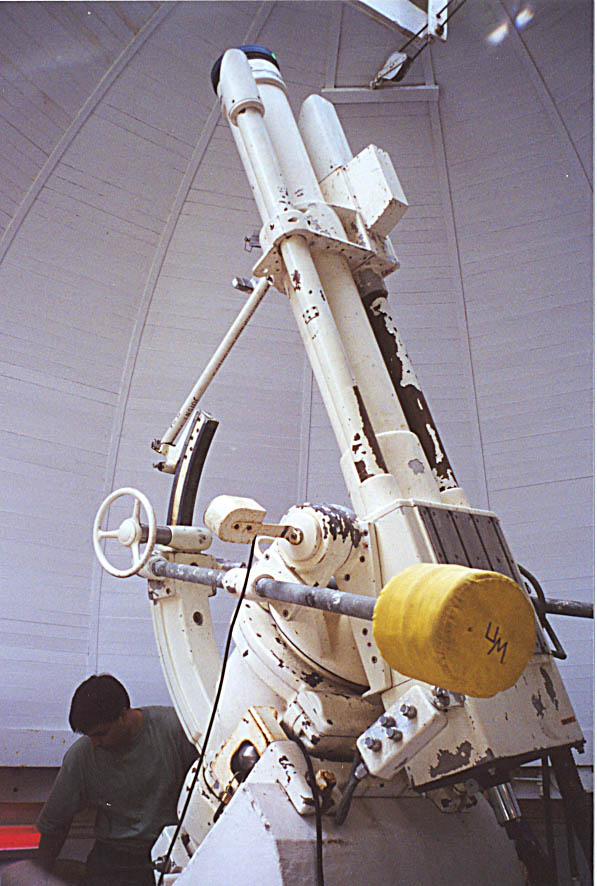 Here's the 6" f/12 refractor that resides in Tower #1. This scope had one of the early Hydrogen-Alpha filters as part of its instrument array to deliver enhanced views of solar activity, such as flares and prominences. Unfortunately, that filter has been lost over the years. The mount restricts the declination travel of the scope to near the ecliptic due to its original role as a solar observing tool.